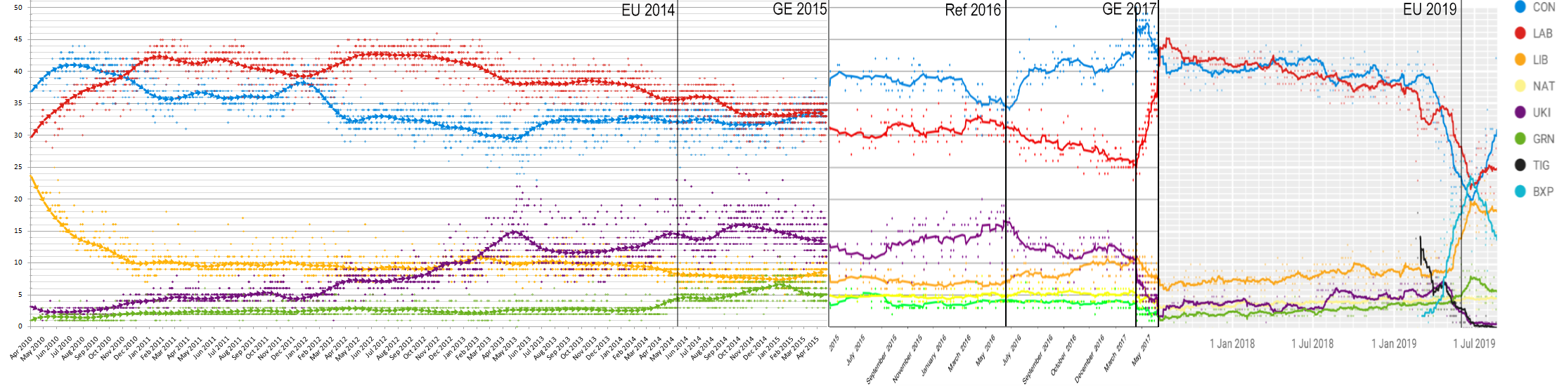 Compiled UK opinion polls 2010-2019 Of course, opinion polls are just indicators so take them with a pinch of salt. It's fascinating to see the political rollercoaster ride of the last 19 years in this form though.