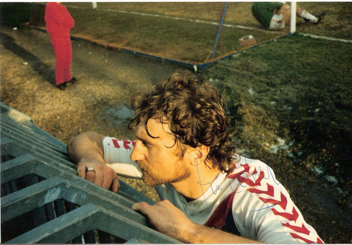 24.2.85 Palace 0 Wimbledon 5 One of the most humiliating games i've ever been to but produced this great photo. Jim Cannon tries unsuccessfully to stop Wimbledon plunder their 3rd goal in front of the Sainsbury's End. His momentum carries him right to the barriers just in front of us; he rests on them in despair and utters the immortal line: "RIGHT F**KING GAME AND A HALF THIS IS!" As you can probably see he later kindly signed the photo, and was very amused to turn the photo over and see that my friend had written word for word what he'd said.
