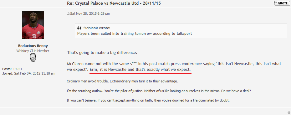 Sat only a few seats away from the Toon on Saturday. They celebrated like they'd won the FA Cup when they scored (fair enough) and then were very vocal. As soon as it was 1-1 they looked like a kid who'd unwrapped a trainset shaped Christmas present to find it was an extra large box of brussel sprouts. Once or twice I felt sorry for them and went to applaud them for their efforts in supporting their team, but ultimately they spent WAY too much time on their players' backs and I just felt their negativity expressed during the 90 minutes helped no one. There are problems at that club, I could genuinely say "Who?" to virtually every name read out from their team sheet, their manager is a pile of w**k and their owner is a prat but to turn so quickly on the team you were singing about 4 minutes ago was just a bit sad to see. I will add though that I don't have a lot against them. If they stay up they stay up, I'm not wishing relegation on them (although last season I thought it'd be amusing after they'd been so vocal about Pardew).