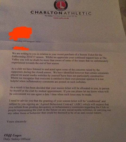 Charlton send letter to season ticket holders, informing them their tickets are on condition of them not tweeting anything negative about the club Edited by cpfc84 (12 Aug 2016 11.15am) This is amazing! It's not even saying, "We would appreciate it if you refrained from...", it's actually a condition! Absolutely incredible.