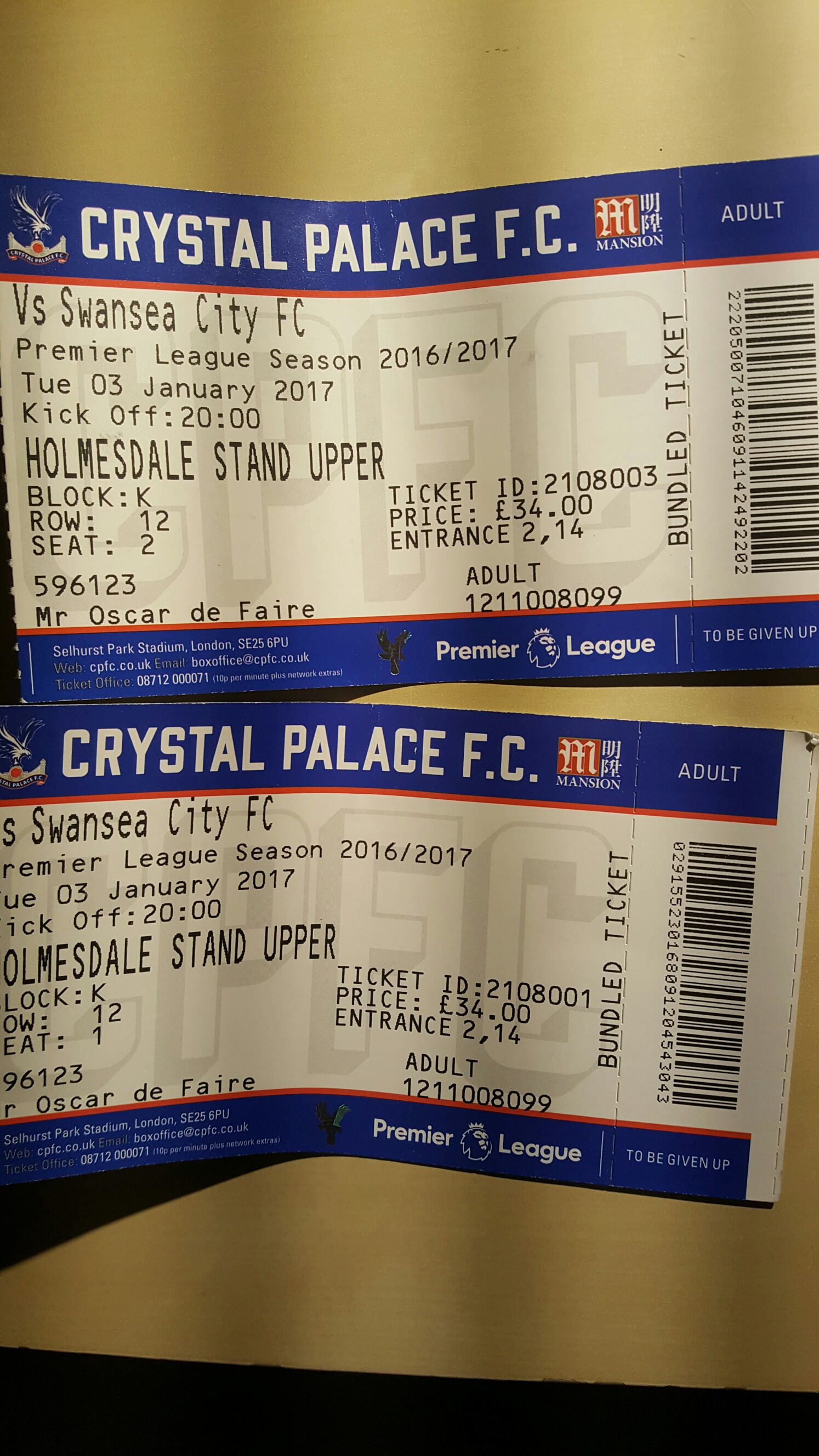 This post has been merged from a topic called 'Swansea tickets x2 for sale' by Old Chap SOLD Cannot make the Swansea game on 3 January so selling my two seats: