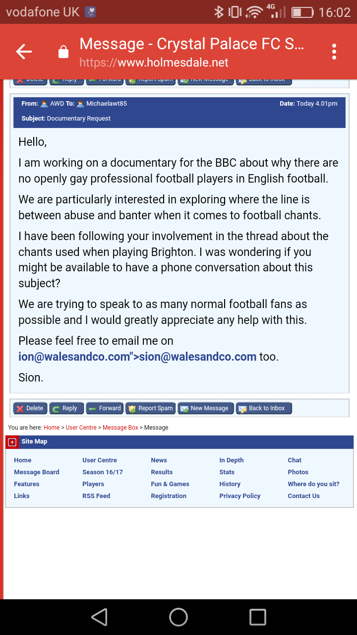 The second person to post on here about this bbc documentry. Notice 'gareths' email address on his profile . Used the name sion. Similar to r he address being used by another poster who has been emailing people wanting them to talk on this subject. A good piece of advice someone gave me. Don't let your ego blind you. Approach this with caution. I wonder if similar things are being posted in any other fans forums for other clubs or is it just palace. Easy to get carried away at games when in a crowd with a mob mentality under the influence of alcohol. Don't say you haven't been warned about the attention which is coming out way . I have attached the email I and other members received. Make of it what you will.. And as James has said lots of members on this site know each other in real life and banter with each other. I would take much of what is written here with a big pinch of salt