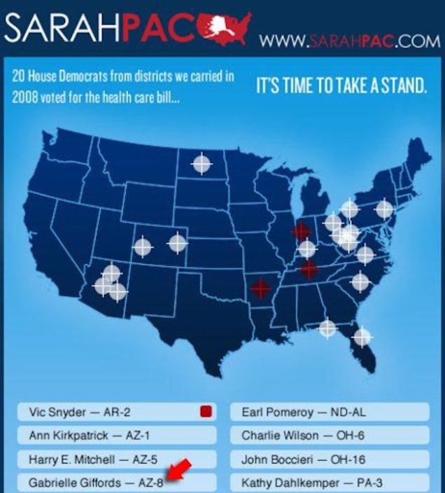 Gabby Giffords is the exact parallel here. Six people died in that shooting, including a 9-year old girl, with Giffords herself miraculously surviving a point-blank shot to the head. 13 others wounded in the attack. As an aside, Giffords had been identified by Sarah Palin as holding one of the seats she believed to be vulnerable in the 2012 election. I've attached Palin's info-graphic for consideration.