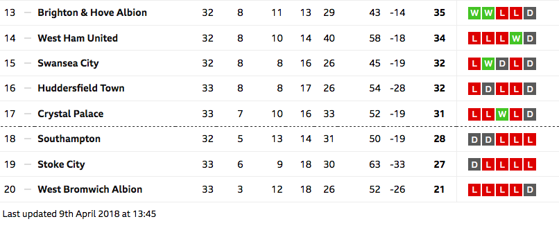 Well they didn’t beat Huddersfield, lost a key midfielder in the process, missed a golden opportunity to see off any relegation dramas. They now walk into carnage. Place yourself in their situation, 7 clear of Southampton who looked a danger throughout yesterday. You then look at away fixtures at Palace , Burnley , Man City , Liverpool. Home to Spurs and Man U. We’d be bricking it. Can see Southampton getting 7 from the 18 available. Couldn’t help notice the reaction of the Brighton players after the final whistle on Saturday, most slumped on the pitch in utter disappointment looking like they’ve just lost a cup final or just been relegated. They know it was a must win,they’ve failed the one glorious chance they had to secure another season. I’ve jumped on the 20-1 relegation odds , it won’t be around for long. Get on it.