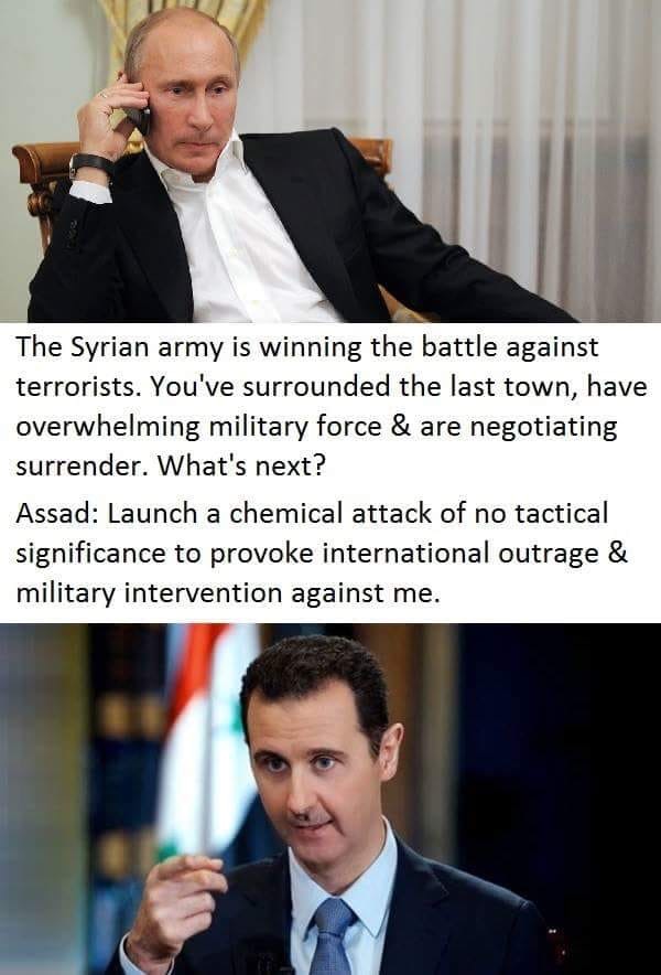 Also can anybody explain to me why Assad, when he is on the verge of actually winning, would launch a chemical attack that serves no strategic purpose, either militarily or politically? He isn't 'winning' very quickly, he's trapped in a stalemate. He's spending money he doesn't have that is being provided to him by Russia who are propping up the entire effort.....Russia itself isn't doing great economically. The pressure to get a move on is significant for him....added to the fact that he and Russia can rely upon a large swell of support from appeasing opinion in the west. If the rebels had access to large scale deployable chemical weapons they would have been using them against Assad.