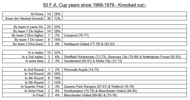 I was wondering how crap we really are in the F.A. Cup so did a bit of research and came up with the following stats for the last 50 years. It's in a jpg as this message board can't handle tables! Between 84-85 & 94-05 (21 years) we managed 16 3rd round exits, a semi-final & a final. Perhaps even worse was the period 87-88 to 96-97 when we managed 8 3rd round exits, a semi-final and a final. Now what would be good is a website that has every clubs complete FA Cup record in an easy to read format. There is this I suppose [Link] very very useful but it's not the real bees knees. Maybe next year.....