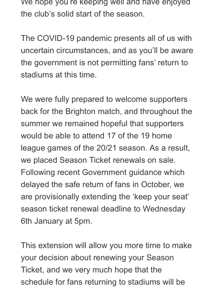 I posted this yesterday in the 19/20 season ticket thread by mistake. CPFC email...... We hope you’re keeping well and have enjoyed the club’s solid start of the season. The COVID-19 pandemic presents all of us with uncertain circumstances, and as you’ll be aware the government is not permitting fans’ return to stadiums at this time. We were fully prepared to welcome supporters back for the Brighton match, and throughout the summer we remained hopeful that supporters would be able to attend 17 of the 19 home league games of the 20/21 season. As a result, we placed Season Ticket renewals on sale. Following recent Government guidance which delayed the safe return of fans in October, we are provisionally extending the ‘keep your seat’ season ticket renewal deadline to Wednesday 6th January at 5pm. This extension will allow you more time to make your decision about renewing your Season Ticket, and we very much hope that the schedule for fans returning to stadiums will be clearer by this point. Please note that this new deadline is provisional and will be regularly reviewed in line with any COVID-19 updates. Should anything change, we will contact you. We hope that you and your loved ones are safe and we are looking forward to welcoming you back to Selhurst Park, as soon as it is safe to do so. With very best wishes from everyone at Crystal Palace F.C.