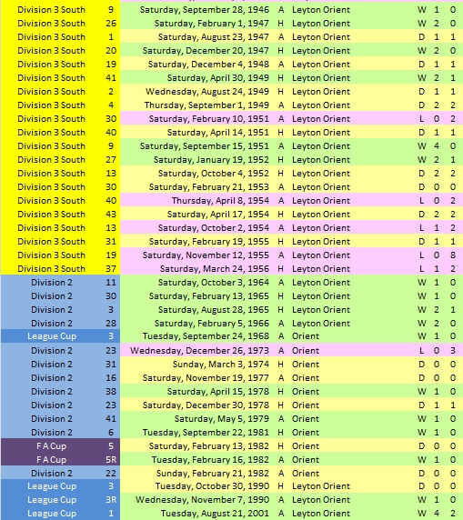 Palace v Orient (since WW2) Interesting. A few years back I found a spread sheet on the web which detailed by year and then by division the 92 clubs. Out of interest I wanted to compare how many years Palace were in each division versus Charlton and Millwall e.g. 13 years in the top flight 40 years in 2nd tier and so on. I don't remember the exact numbers but at the time Palace and Charlton were almost identical with Charlton having been in the top flight more years than us (we must have overtaken them now). Anyway I guess this is how rivalry starts as outside of the top division all 3 clubs seems to be have a similar record over 100 years which meant playing each other more often than not.