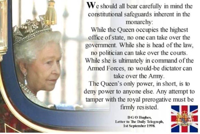 Found this on Twitter, and thought I would share - it shows just what a safeguard the Monarchy is. it is a very dubious thing to give real power to an unelected 95 year old. let her smile , attend functions and eat cake. No more than that.