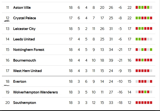 I hope you are right Grumpy . I just hope they dont leave it too long if things dont change . Pat is a lovely guy but , i just dont see 3 teams more s***e than we are at the moment , I thought Southampton were one until yday . If Wilf leaves its gonna be an even tougher fight . Only time will tell . It's not about a couple of games but the whole season and yes we have had some awful performances plus results but look at the table. 5 teams below us before you hit the bottom 3 so yes already many teams who are more s**t. Everton who is the team top of those 3 have 15 points and played 18 games - Palace have 22 points and only played 17 games meaning 7 points gap. About to hit half way of the season lots of games left but it really would take a lot of those other teams all getting good results and Palace getting none. Look at Last 6 league games of the teams below us pay no attention to Southampton game. Edited by grumpymort (08 Jan 2023 10.04am)