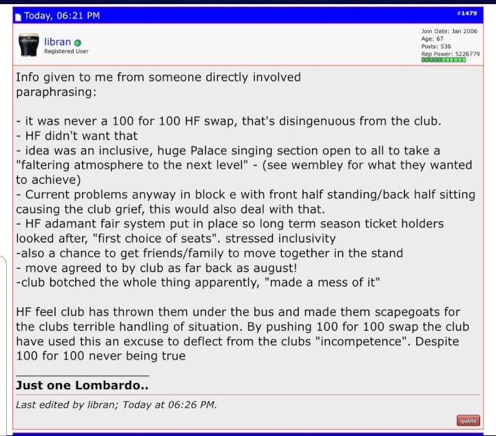 And according to the post above it looks like no one was being forced to move. The block would have been open to everyone. It's about creating new singing section, not about removing 100 for 100. Something needs to be done with block E regardless. Half the people want to stand and half want to sit. There are weekly arguments in that block which isn't good for anyone. But the HF moved to the front of blocks E & F, if the people in other rows didn’t accept the “offer” of relocation (perhaps nowhere 4 or more could sit together) then they would have to stand the whole match. There are some who are not disabled but find it difficult to stand for 90 minutes So if they want to sit and watch the game (maybe joining in singing if that’s allowed by anyone other than ultras) then they would have to move
