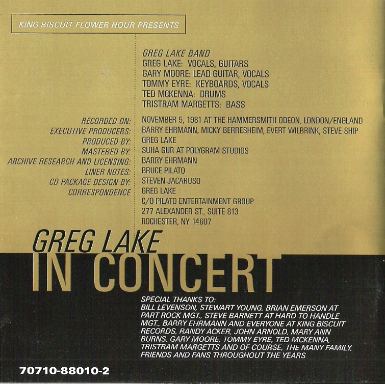 Todays first download is a solo set by Greg Lake. I've not seen a solo boot by Greg before, so I immediately grabbed it - then I found it was a King Biscuit Flower Hour Show - so I knew that it would be a quality sounding show.... and it is. It sounds superb and is a wicked set. He starts with a couple from his days with ELP, then does a cover of "Parisienne Walkways" before finishing with a couple from his days with King Crimson - and a cracking version of In The Court Of The Crimson King..... this is thoroughly recommended.... a top bootleg...... Here is a download link I found for :- In Concert : Live at the Hammersmith Odeon, London 1995 - Greg Lake (Bootleg) Quality : Superb Tracklisting : 01. - Medley- Fanfare for the Common Man-Karn Evil 9 (6:10) Download Link : [Link] Filesize : 140MB (Including Artwork) Back Cover : [Link] Enjoy!