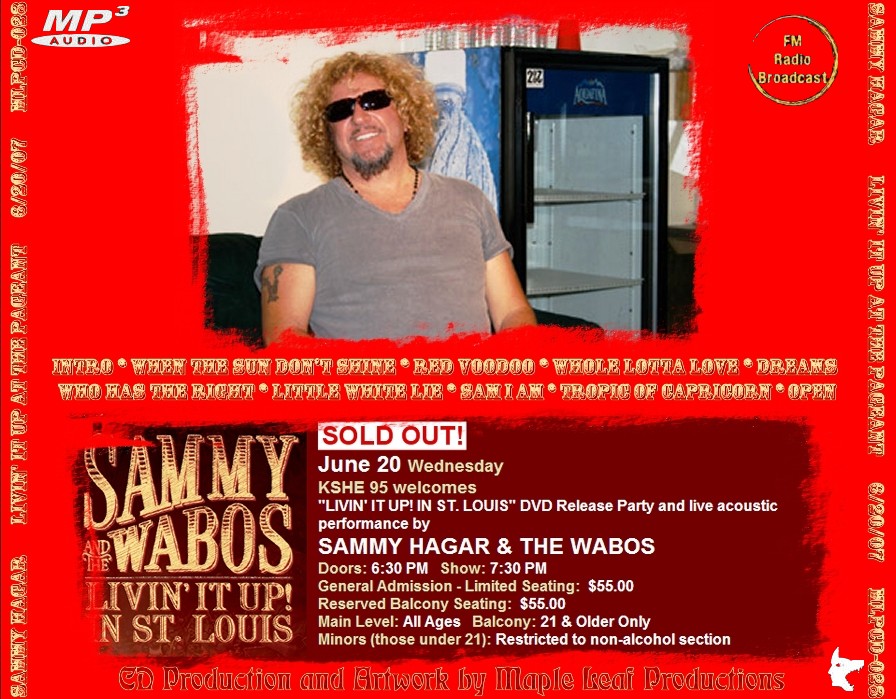 Todays first download is an acoustic set by Sammy Hagar and the Wabos that was recorded live at The Pageant, St Louis, Missouri in June 2007. This is in superb quality and the audio has been taken from an FM radio broadcast by KSHE 95 FM. The gig was to promote the release of the bands dvd "Living It Up". This show has been edited to take out some of the language... Sammy if very proficient at dropping the F bomb. There is a lot of Sammy chat during the show - most has been removed as his voice was going towards the end of the show.... this is thoroughly recommended..... Here is a download link I found for :- "Livin' It Up" At The Pageant, St. Louis, Missouri 20.6.07 - Sammy Hagar & the Wabos (Bootleg) Quality : Superb Tracklisting : 01 - Intro Download Link : [Link] Filesize : 63.7MB (Including Artwork and Tracklisting) Back Cover : [Link] Enjoy!
