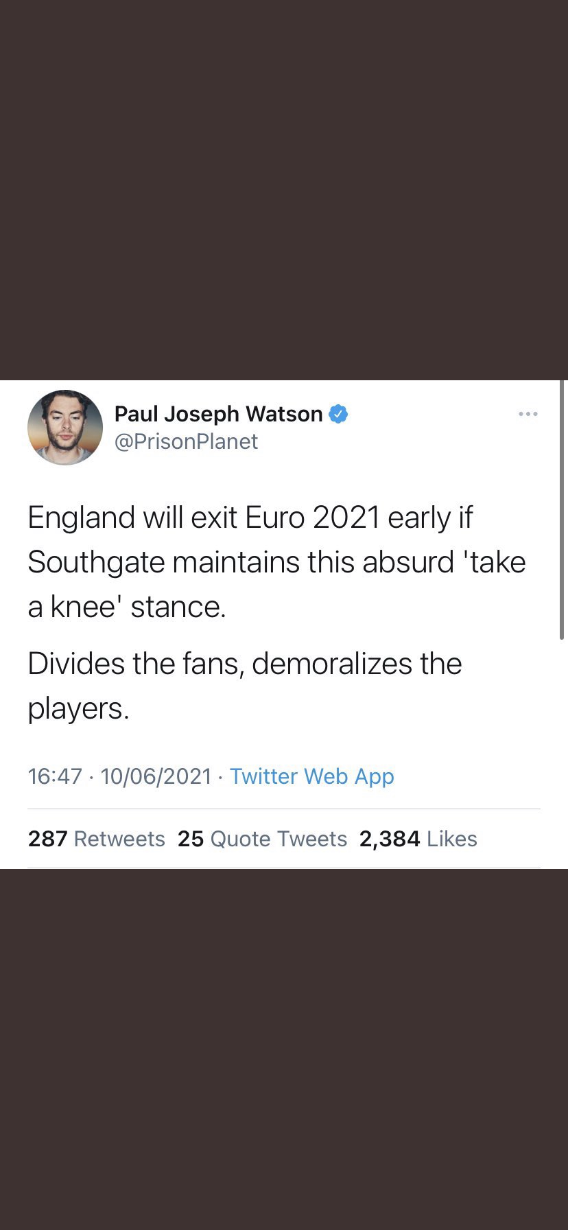 PJW being spot on as usual. Must ache being just so right all the time. It's a stupid comment from PJW I support the team I don't support taking the knee. Anyway what has that to do with how England play. If we went out at the first stage I would not blame the Knee Taking but the players being crap.