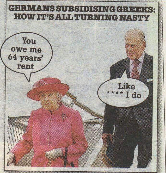 Edited by chris123 (08 Jul 2015 9.49am) .................................................... According to the BBC, German "massacres" in Greece in WW2 included one where 218 civilians were killed in Distomo in 1944. In 2000, the Greek Supreme Court ruled Germany should pay €28m to the relatives of those killed, although the decision was not enforced, and the dispute effectively reached stalemate in international courts in the following years. Maybe the German government could pay that one now for a start.If ever a debt (even in the non legal sense) remained due from the "moral giants" heading up the economic powerhouse of the EU......or is it only bank debts that count for anything with such "moral giants"? Edited by legaleagle (08 Jul 2015 11.57pm)