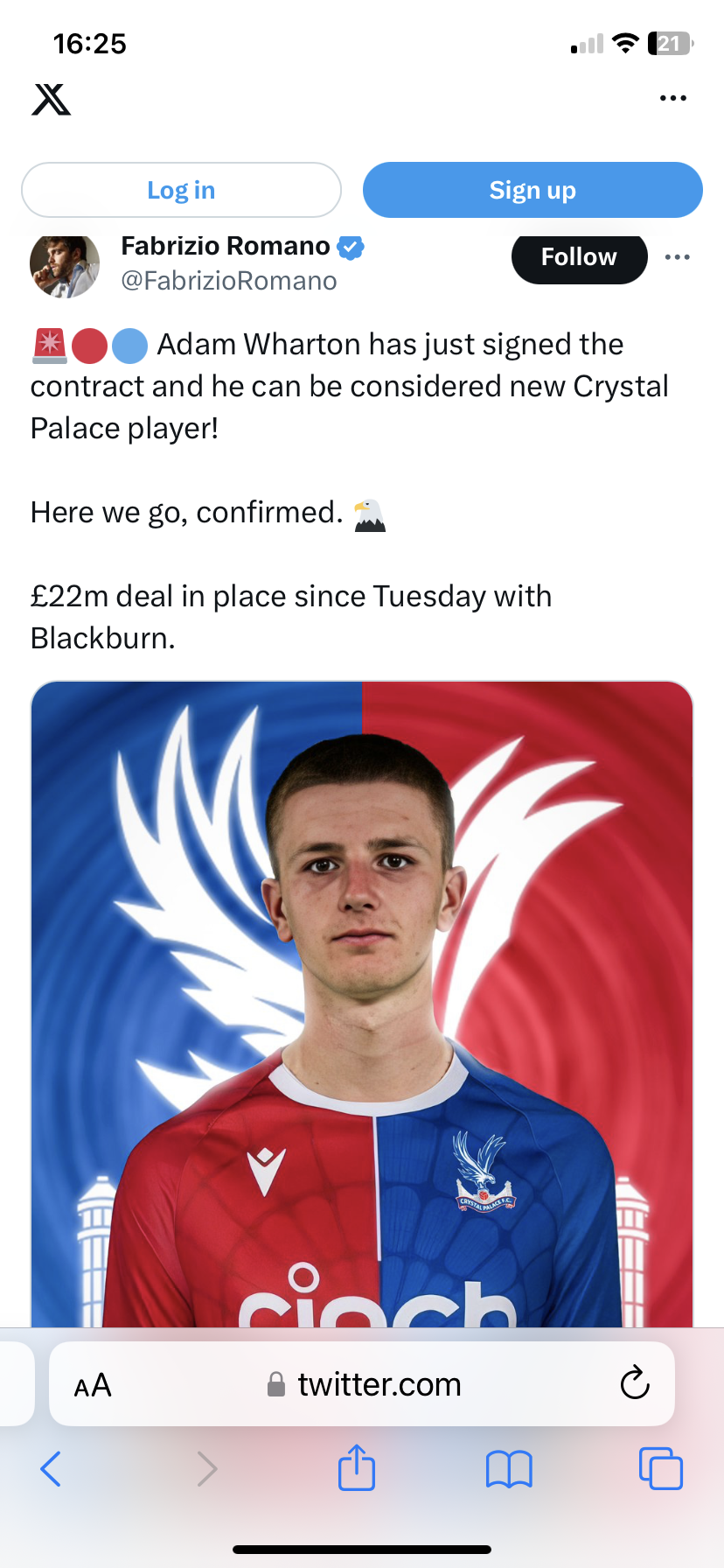 There are plenty who said it was signed last night. So Palace doing there usual pr stunt. It was reported(ssn/bbc) there was a hiccup/disagreement with B'burn as they wanted him back on loan & Palace said no.