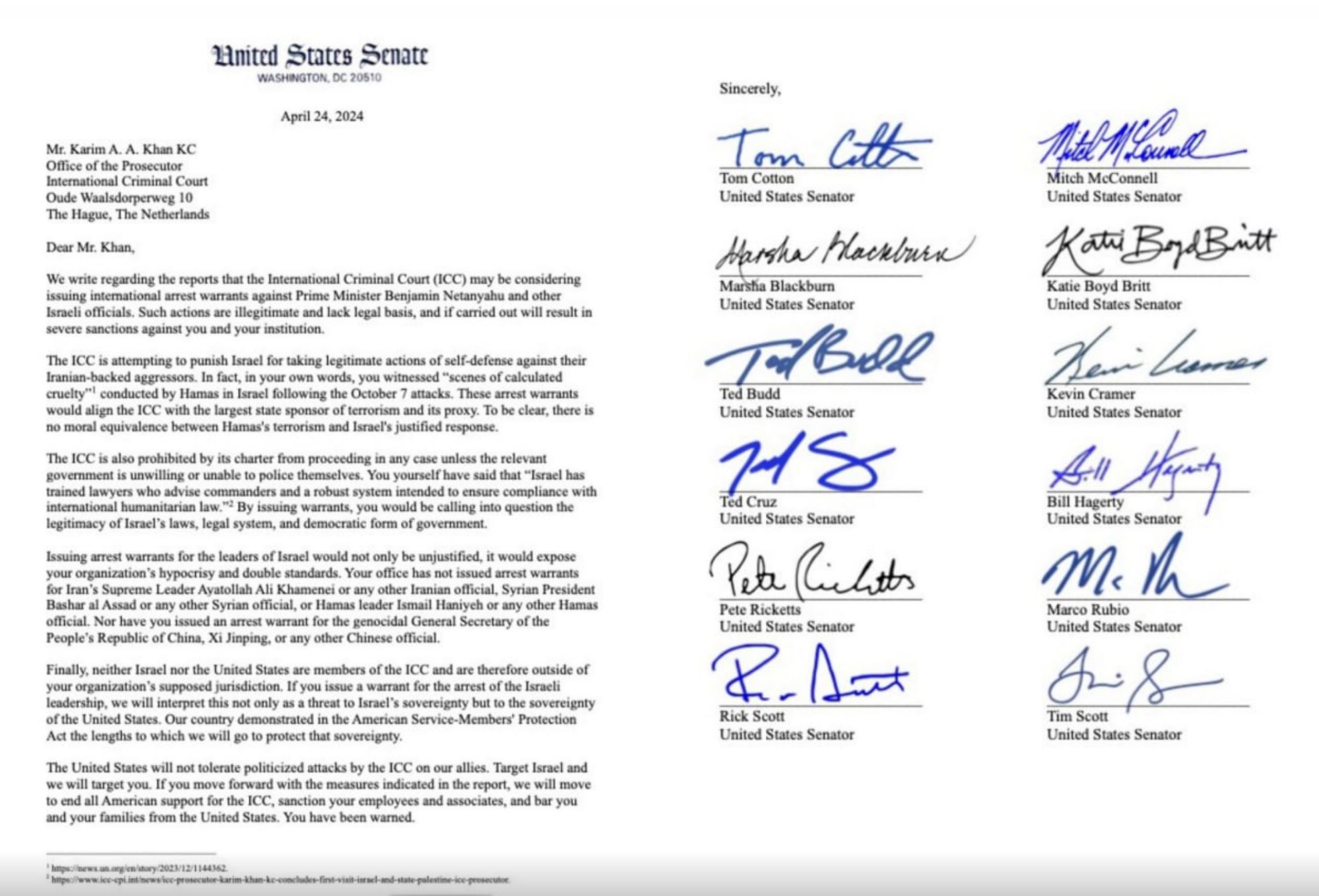 12 US senators have threatened the International Criminal Court, not to proceed with an arrest warrant for Netanyahu for crimes against humanity. When you hear people....usually on the left or social liberals talk about 'international law', you have to smirk at the gaslighting that goes on. I can still hear Nick Clegg and the liberals waffling about it on Iraq....Bush and Blair. International law doesn't exist.....what exists is the rule of the powerful over the less powerful using whatever language they wish to cloak it in....Always has, always will....The 'international law' mob usually talk more extraneous waffle than a Kier Starmer speech. Nothing happens without the powerful agreeing to it.....They don't follow 'laws' they don't agree with and never will. Reading the letter makes that very clear. Edited by Stirlingsays (07 May 2024 3.30am)