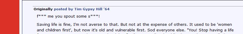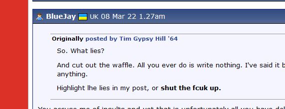 You said I told you "repeatedly" to "f*** off". Where and when? If you are going to make accusations be prepared to back them up. So BACK IT UP! And as you want to trade songs, here's one for you [Link] edit: off to bed now, which will please you. Edited by Tim Gypsy Hill '64 (05 May 2022 1.12am) I've found a "shut the fcuk up" now too... you've reeled off so many expletives there just appears to be no end to it to be honest with you. So it would appear that you're talking nonsense as per. Calm down. I hope you've been drinking, at least that way you'll have an excuse. I'll ignore any further nonsense, as there's bound to be plenty of it if not. Edited by BlueJay (05 May 2022 1.34am)