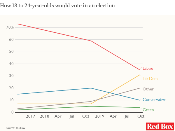 YouGov for The Times: How 18 to 24 year-olds would vote in an election. That's quite a shift. No more 'Jeremy Corbyn' Glastonbury chants then! Ohhhhh Jo Swinson?!?!