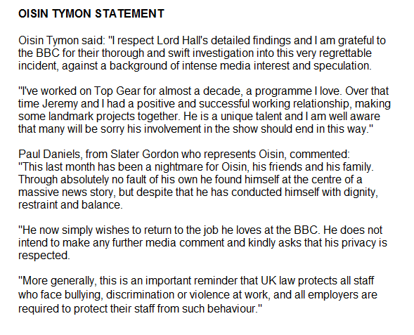 - earlier on 4 March, studio recording of Top Gear had taken place in Surrey and the presenters had travelled that same evening to the location shoot in North Yorkshire; - the incident occurred on a patio area of the Simonstone Hall Hotel, where Oisin Tymon was working on location for Top Gear; - the physical attack lasted around 30 seconds and was halted by the intervention of a witness; - it is the case that Oisin Tymon offered no retaliation; - the verbal abuse was directed at Oisin Tymon on more than one occasion – both during the attack and subsequently inside the hotel – and contained the strongest expletives and threats to sack him. The abuse was at such volume as to be heard in the dining room, and the shouting was audible in a hotel bedroom; - derogatory and abusive language, relating to Oisin Tymon and other members of the Top Gear team, continued to be used by Jeremy Clarkson inside the hotel, in the presence of others, for a sustained period of time; - it is clear that Oisin Tymon was shocked and distressed by the incident, and believed that he had lost his job; - following the attack, I understand that Oisin Tymon drove to a nearby A&E department for examination; - over the subsequent days, Jeremy Clarkson made a number of attempts to apologise to Oisin Tymon by way of text, email and in person; and - it is the case that Jeremy Clarkson reported the incident to BBC management. It was not disputed by Jeremy Clarkson or any witness that Oisin Tymon was the victim of an unprovoked physical and verbal attack. It is also clear to me that Oisin Tymon is an important creative member of the Top Gear team who is well-valued and respected. He has suffered significant personal distress as a result of this incident, through no fault of his own.