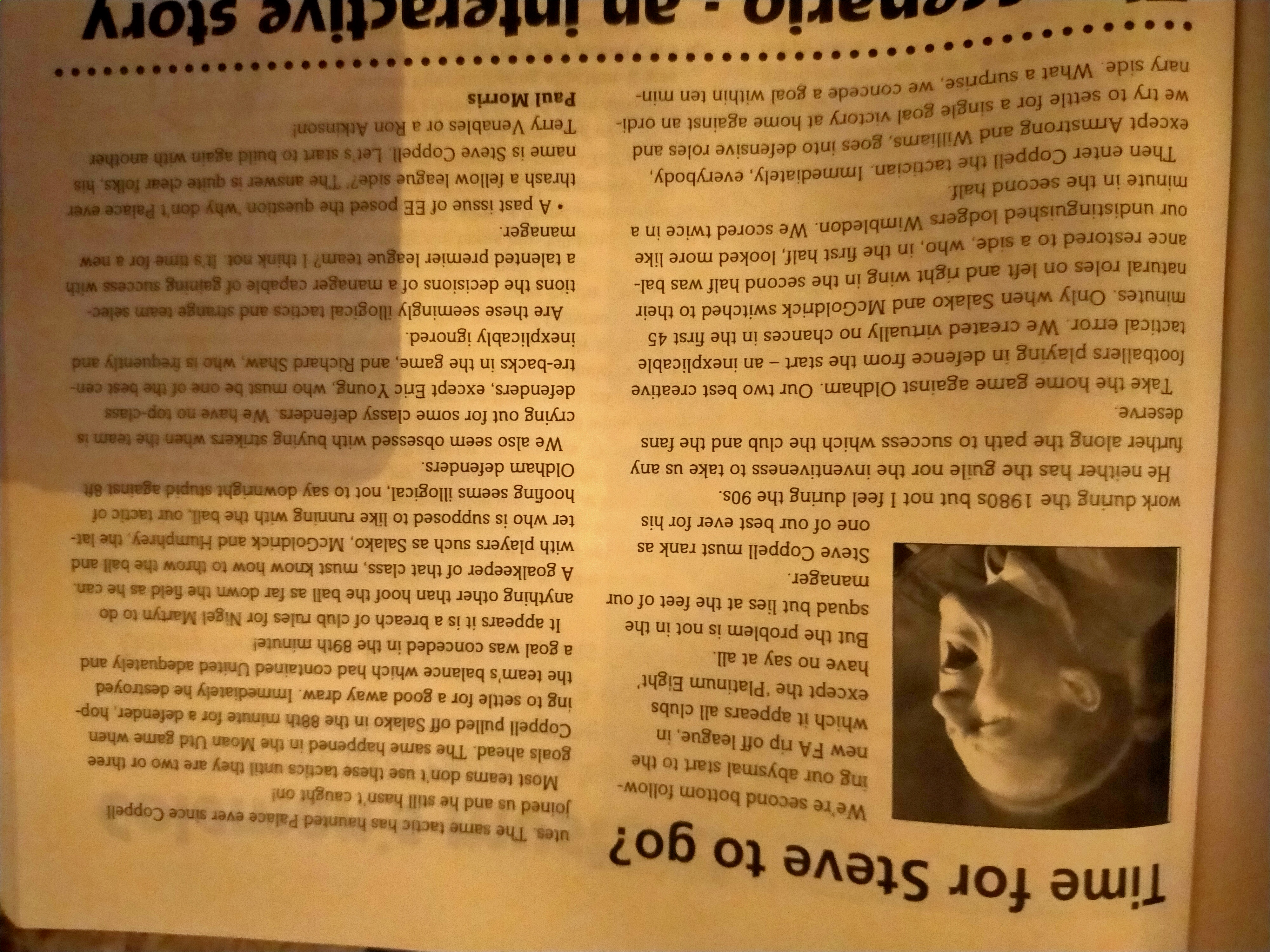 It was a bit of a trick question in fairness. It was from Palace in the big time, the best of Eagle eye 1987 to 1994. Which of course means that the clueless, incompetent manager drawing such hostile criticism was in fact, Steve Coppell. Yep, that Steve Coppell. Proof perhaps that nobody in our clubs history has been able to make all the people happy all the time! Shame there wasn't a Steve Out thread at the time... My odds were even longer than I originally thought! Interesting contribution though I have to say.
