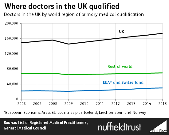 How? Are you going to make people become Doctors? Or more importantly, get them to stay in the country or the profession? 11% of all NHS staff and 26% of GPs were born outside of the United Kingdom*. We're so short of quality Doctors and Nurses that we're desperate for more people to come here and help. What about teaching? We're losing tens of thousands of teachers a year and applications for training have also fallen I believe? *source: [Link] Have you actually read your Grauniad source? It specially states that the figures do not include GPs!