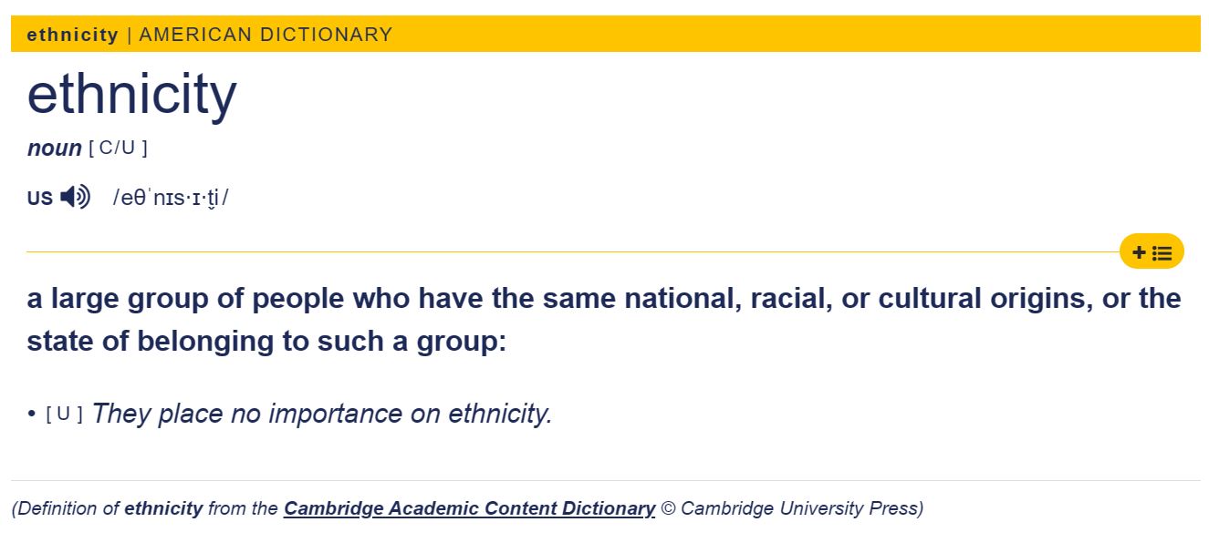 You are wrong. Ethnicity includes all aspects of someone's background. It does not exclude their race....which again, you try to reduce to skin colour as if that's all it means. Yours is the politics that doesn't deserve traction because it's based on lies, half truths and deceptions. Edited by Stirlingsays (01 Jun 2023 11.49am) You aren't arguing with me! You are arguing with every Dictionary I have read on this subject. None of them states that skin colour plays any role at all in a person's ethnicity. You obviously decided to ignore the extract I posted, presumably because it doesn't match your ideas!