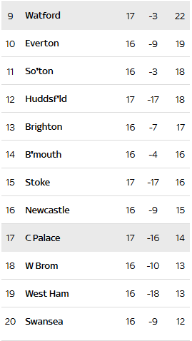 Out of the bottom three, and tomorrow evening West Ham have Arsenal, West Brom go to Anfield and Man City visit Swansea.