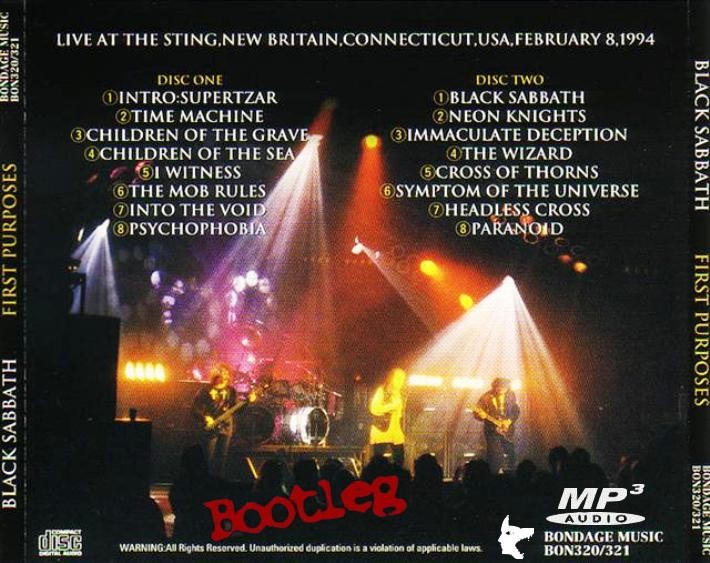 Todays first download is a set by Black Sabbath that was recorded on the bands "Cross Purposes" tour of 1994. This set was recorded at The Sting, in New Britain, Connecticutt and is in superb quality -- top notch sound. This was the first night of the tour - and a different line up for the band - no Ozzy!. Still it's a great sounding set and thoroughly recommended. Here is a download link I found for :- "First Purposes" Live at The Sting, New Britain, CT. 8.2.94 - Black Sabbath (Bootleg) Quality : Superb Tracklisting : Disc 1 Disc 2 Download Links : Part 1 : [Link] Part 2 : [Link] Filesize : 195MB (Including Artwork) Total Time: 01:25:17 hour/s. The Line-up : Back Cover : [Link] Enjoy!