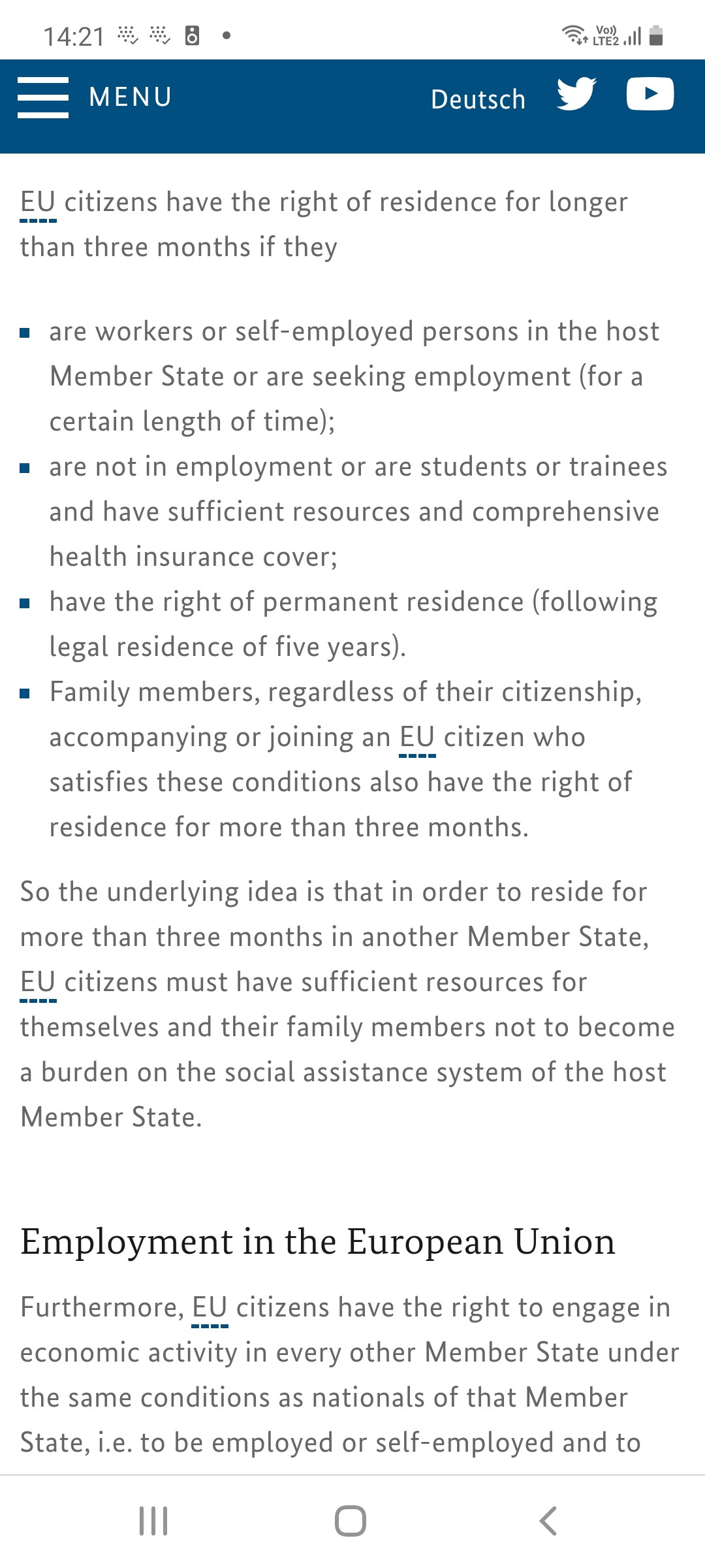 At what point will Remainers actually start to criticise the EU? 4.5m EU citizens have registered for permanent residency in the UK for free. The EU does not have a similar scheme my friend in Italy it cost about £3k all in for her and her husband including health insurance. EU Citizens can visit the UK for 6 months, UK visitors to the EU its 90 days. EU good UK bad. I voted remain. Mostly because of the uncertainty, a dislike of UKIP, knowing it would become a s***show, and fear about uncertainty. Many remainers fail to look at what the EU actually does... they probably have no idea who their MEP is (I dont) There were restrictions to public services that the UK could have imposed on people moving to the UK could have imposed whilst we were members of the EU, but we didn't. Such as in Germany you need comprehensive health care cover. The images taking from the German governments website. They state that the Idea of the restrictions are to prevent people moving becoming a burden on the state. Britain had negotiated concessions to this prior to leaving, but the rules that people will have to earn over £25,000 a year will mean most people moving hear will be paying the same amount of tax as the average earner. It resolves a problem the EU has repeatedly failed to address properly. Had they done something like this previously, we might not have voted to leave. The EU has got to take some accountability for the leave vote, but it hasn't. It's just blamed everyone else, like Jeremy Corbyn, or people supporting Roy.