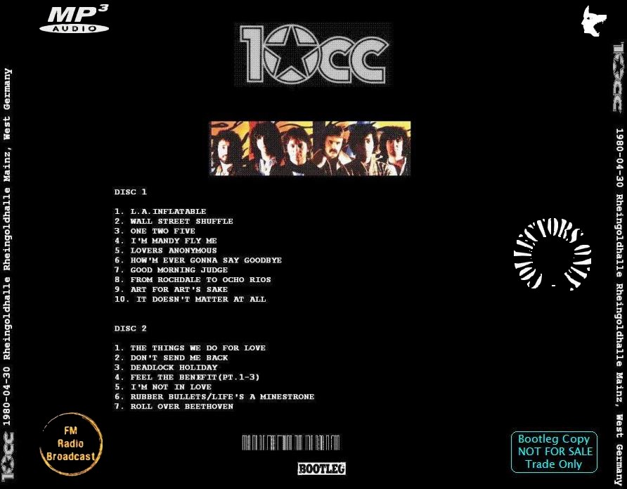 Todays first download is a set by 10cc that was recorded in Mainz, Germany in 1980. This is in superb quality and the audio has been taken from an FM broadcast. This isnt the original line up of the band - they are missing Godley and Creme - so it's really 10cc in name only. They still put on a good show which features many of their hits over the years. Boots by this band that are in good quality are very rare - no matter what the line up, so if you like 10cc - grab this one!. Here is a download link I found for :- Live at the Rheingoldhalle, Mainz, Germany 30.4.80 - 10cc (Bootleg) Quality : Superb Tracklisting : Disc 1 Disc 2 Download Link : [Link] Filesize : 225MB The Musicians; Back Cover : [Link] Enjoy!
