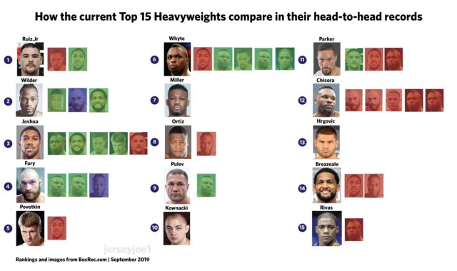 Worth a look - How the current top 15 heavyweights compare in their head to head records It's surprising how few fights there's been between them all really. Boxing politics. Anthony Joshua stacks up fairly well considering his boxing reputation is currently on the ropes. Not sure how they rate Fury at number 4 whilst Wilder is at number 2. Hopefully 18 months down the line there will be a lot more of these match up having been made.