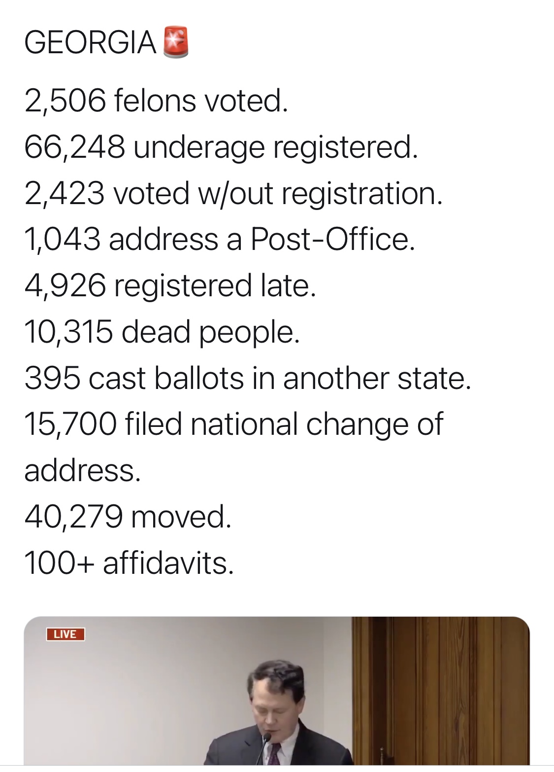 Where and how are the Democrats seeking to stop investigations? They are not getting involved. Political parties don't run the elections. There are independent, legally mandated organisations to do that and they all co-operating in arranging re-counts etc. The Democrats have more important things to do. They have a big mess to start to clean up in January. There is no evidence of widespread fraud coming to light. There are widespread fraudulent claims of fraud coming to light, all failing to provide any evidence and being thrown out by Courts, often with scathing comments. Your "dark forces of the industrial military complex an all other interested parties" made me smile. It certainly isn't known by us all. It's just another conspiracy theory believed by a gullible few. Oh well. At least it gives you something to do and while you are getting angry on your keyboard you won't be doing anyone any actual harm. Edited by Wisbech Eagle (04 Dec 2020 12.51pm) So Eisenhower was making it all up was he? Of course. He was only the president. What did he know. We should all come to you for information.