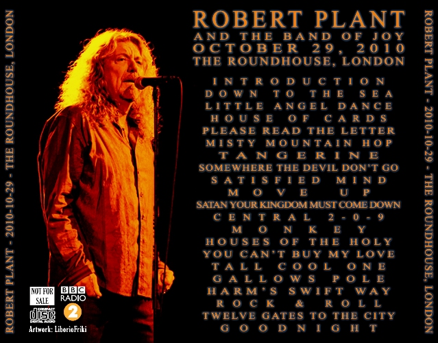 Todays second download is a set by Robert Plant and the Band Of Joy which was recorded last Friday evening at The Roundhouse in London. This was a gig which was part of this years BBC Electric Proms 2010. This bootleg is in superb quality and was a BBC FM radio broadcast. Robert plays songs from his newly released album with the Band Of Joy as well as some old favourites by Led Zepellin. This is fantastic - thoroughly recommended..... Here is a download link I found for :- The BBC Electric Proms 2010, The Roundhouse, London 29.10.10 - Robert Plant and the Band Of Joy (Bootleg) Quality : Superb Tracklisting : 01. Introduction Download Links : Part 1 : [Link] Part 2 : [Link] Filesize : 229MB (Including Artwork and Tracklisting) Back Cover : [Link] Enjoy!