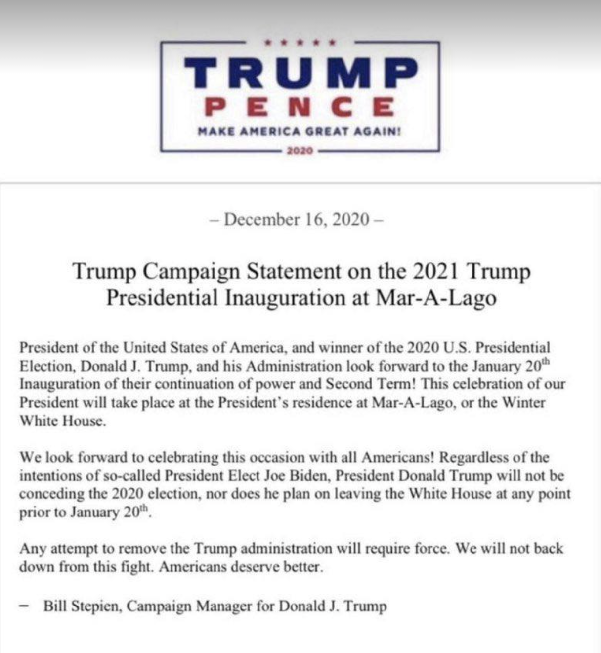Oh and on the subject of mar-a-largo... According to The Washington Post, some of Trump’s Palm Beach neighbors have written a formal letter, delivered to both town officials and the Secret Service on Tuesday, stating in no uncertain terms that the president had better find housing elsewhere. Noting an agreement Trump signed in 1993, the letter reminds all those copied that he lost the legal right to live at the club full-time and that in order to “avoid an embarrassing situation” wherein the soon-to-be-former president moves in and then is forced to leave, the town should notify Trump ASAP that he cannot live there. The current residency controversy tracks back to a deal Trump cut in 1993 when his finances were foundering, and the cost of maintaining Mar-a-Lago was soaring into the multimillions each year. Under the agreement, club members are banned from spending more than 21 days a year in the club’s guest suites and cannot stay there for any longer than seven consecutive days. Before the arrangement was sealed, an attorney for Trump assured the town council in a public meeting that he would not live at Mar-a-Lago. Should be fun.
