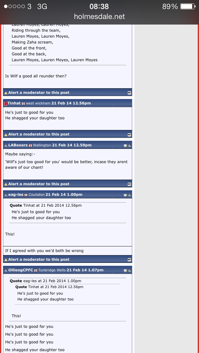 Agreed Willo Can't believe there's even a post on this utter sh*te but as we're here I would imagine the Noades mother/wife/auntie/cousin whatever bit of the song originally came about after several months of deep thought by some spotty teenage a*sewipe or Neanderthal knuckle dragger.Never sung it, never will and as for the singing of the Lauren Moyes song and coin chucking.. grow up you fcuking morons, your a disgrace and embarrassment to our club I'll probably get more s*** for this from the righteous fans but this is what YOU posted in a thread about songs for Moyes and his daughter!?!? The level of hypocritical has just gone to a whole other level now.