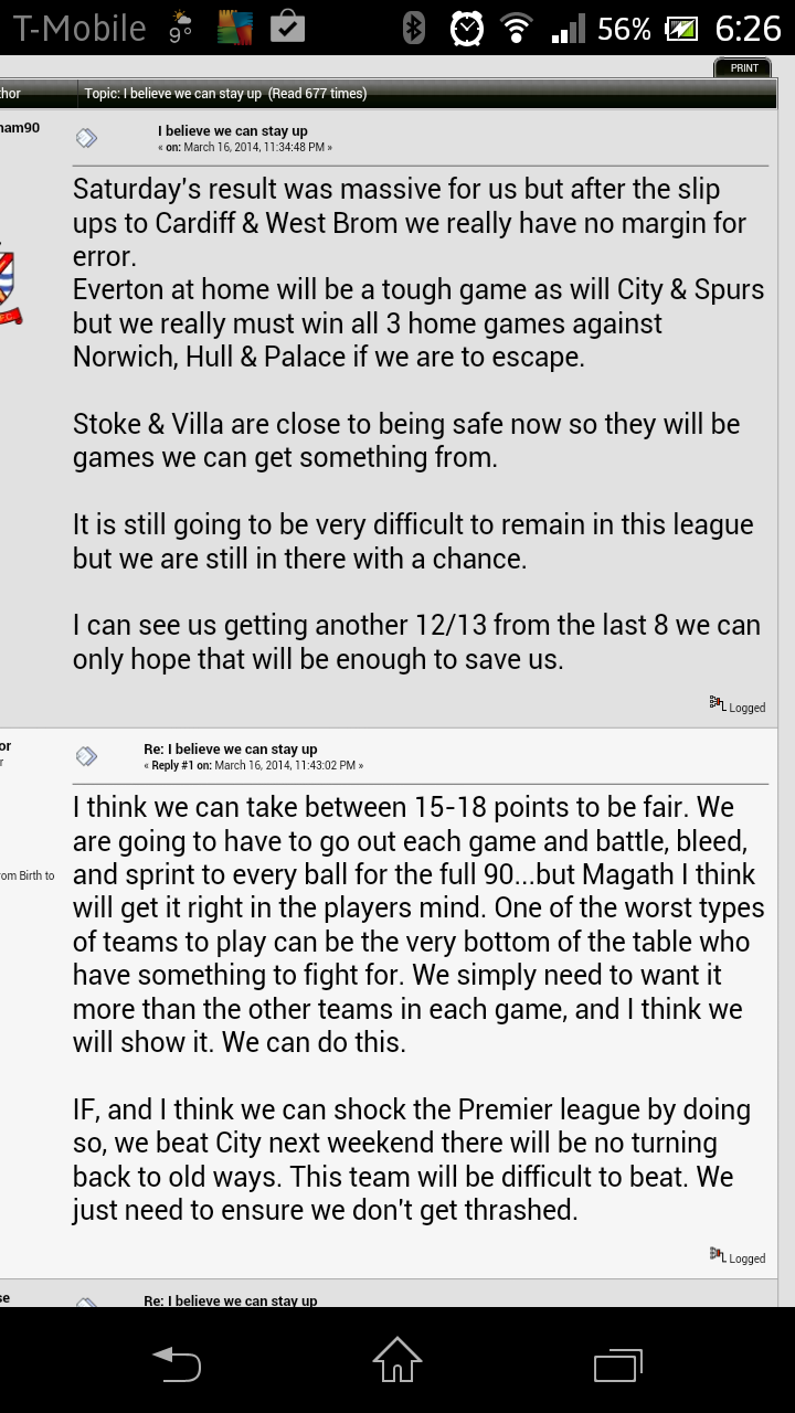We are forgetting Norwich and Swansea. Remaining games - "big" teams (inc Saints but exc Newcastle) in parenthesis: West Brom 9 (3) I can see West Brom pulling free. Good form, game in hand, "easiest" run-in. Cardiff and Fulham have enviable run-ins; but are NVG and may struggle to pick up the points from their rivals to get out of the bottom 3. Sunderland - fixture congestion and exhaustion may take their toll; but not all 5 relegation rivals are likely to be as mean as us. I suspect they will pick up just enough points to finish above us. Swansea is difficult. Their current form is not good and their run-in is similar to ours. However, they have 2 points on us and a much better goal difference. Sadly, I suspect they have enough to keep them up. Meaning (inevitably) It may be between us and Norwich for that last relegation slot. Is it not always so? If I were a betting man I would say that we will grab that 17th place, if only on goal difference. Howewever, it will only be decided at the final game.