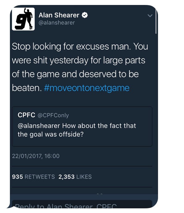 Shearer really is the worst kind of pundit. Bitter and clueless. Still hurts that he didn't get the Palace job I guess and Parish mugged him off on twitter Edited by iheartcpfc (22 Jan 2017 5.05pm)