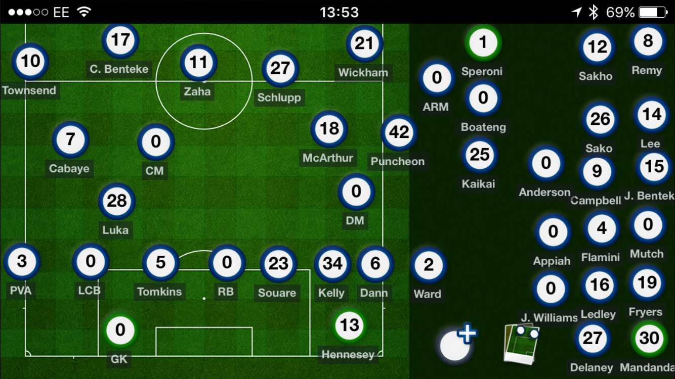 Midfielders - Hiram Boateng, Yohan Cabaye, Luke Dreher, Mathieu Flamini, Noor Husin, Sullay KaiKai, Joe Ledley, Chung-Yong Lee, James McArthur, Luka Milivojevic, Jordon Mutch, Michael Phillips, Jason Puncheon, Bakary Sako, Andros Townsend, Aaron Wan-Bissaka, Jonathan Williams, Wilfried Zaha