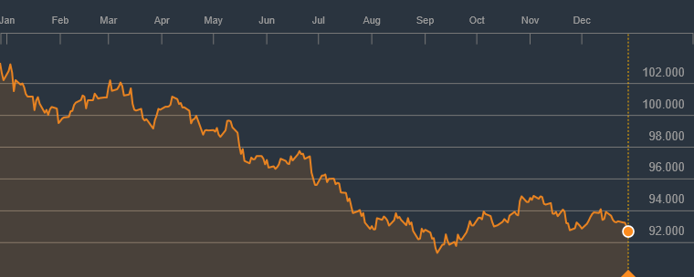 Exactly. And, further, Bitcoin cannot be destabilized by the haplessness or stupidity of a single government (or its voting population). [E.G. US Dollar spot value over the last year] Edited by Ray in Houston (28 Dec 2017 5.22pm)