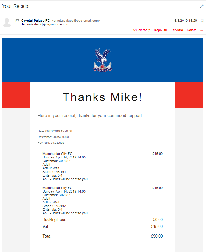 Got 3x tickets - Holmesdale lower block A £25 each Pm me if interested or message 07774098187 Will send via e-tickets Tom Sold Edited by tgpalace (12 Apr 2019 2.01pm) Edited by tgpalace (13 Apr 2019 8.04am)