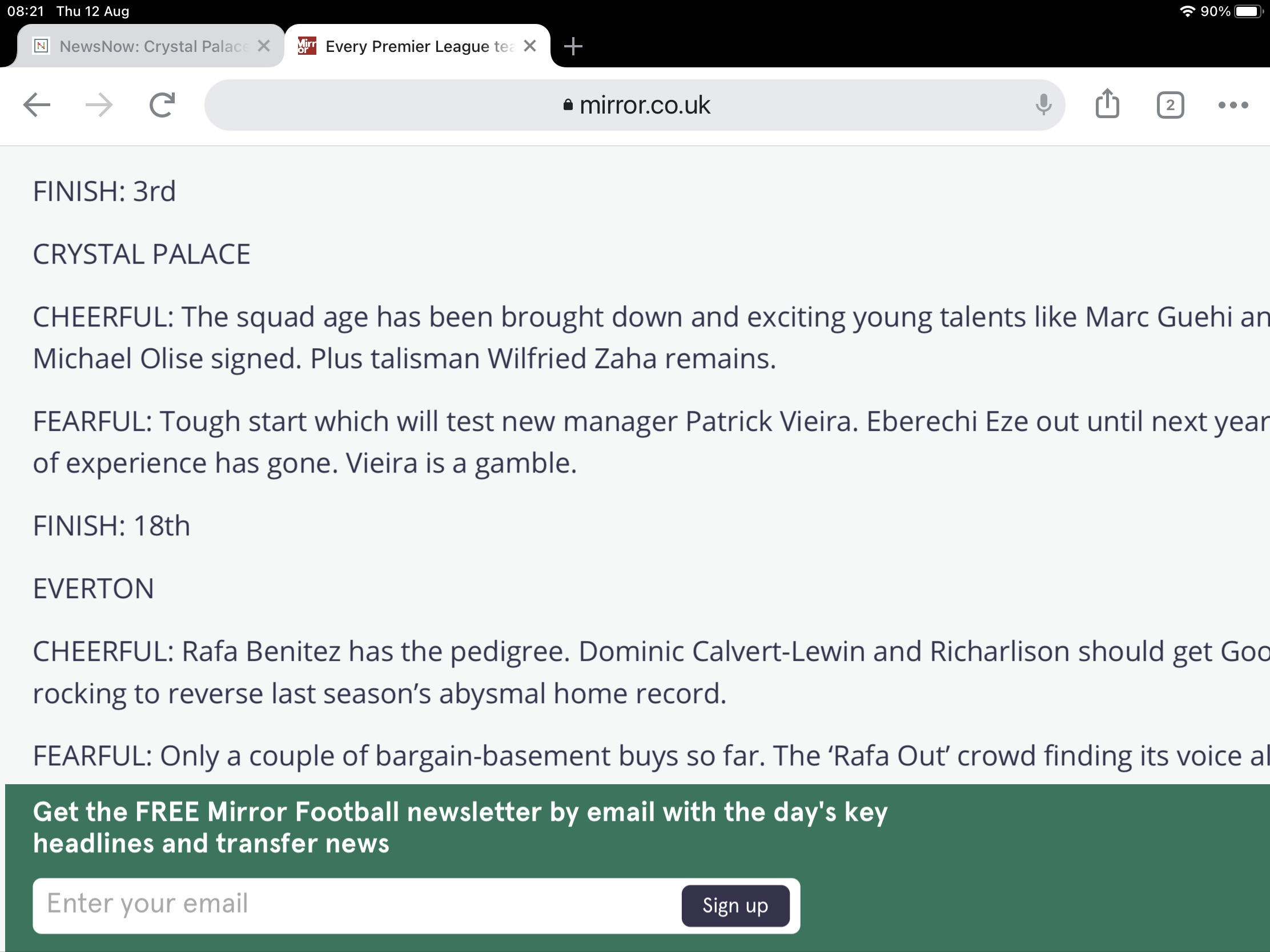 Guaita Clyne Guehi Anderson Mitchell Eze Jairo/kouyate Gallagher Olise/Nelson Armstrong Wilf Benteke, mateta ,ayew ,Rak-Sakyi, Banks,McArthur,Tomkins,Kelly,Schlupp,Ward,butland That is a top 8 team and squad IMHO that is a bottom 8 squad. Eze and Olise and injured with no return date and Armstrong has just signed for the Saints. That midfield we be overrun, and Eze showed repeatedly last year that he has no defensive ability. Surely it's Jimmy Mac, Jairo/Luka and an.other probably Gallagher.