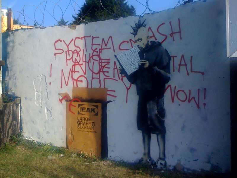 I honestly don't think Banksy is very good. Also I don't understand why his graffiti is considered to be art that needs to be protected whereas anyone who attempts to "enhance" one of his works with their own artistic additions is accused of vandalism.