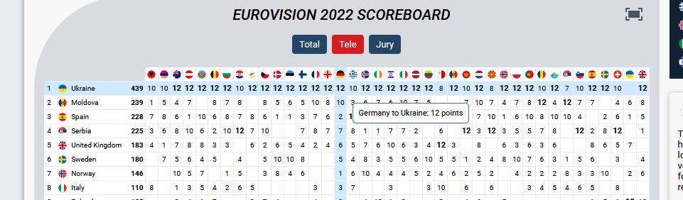 Thought it was interesting that the UK public voted for Ukraine, Poland, Moldova and Lithuania in that order. Probably reflects who's actually watching it over here. That said, I thought Moldova were brilliant and should have won it hands down.