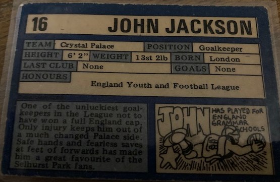 Very sad news. Bill Glazier was my first Palace keeper and I was gutted when he left. But soon got over it. Does anyone remember a short period when he and (Ray?) Millington shared the position? Jacko soon made it his own. I WAS John Jackson many times in Thornton Heath Rec with, literally, jumpers for goal posts and my friend Vincent taking shots. A real hero of mine and a sad day. Condolences to his family. RIP Jacko.