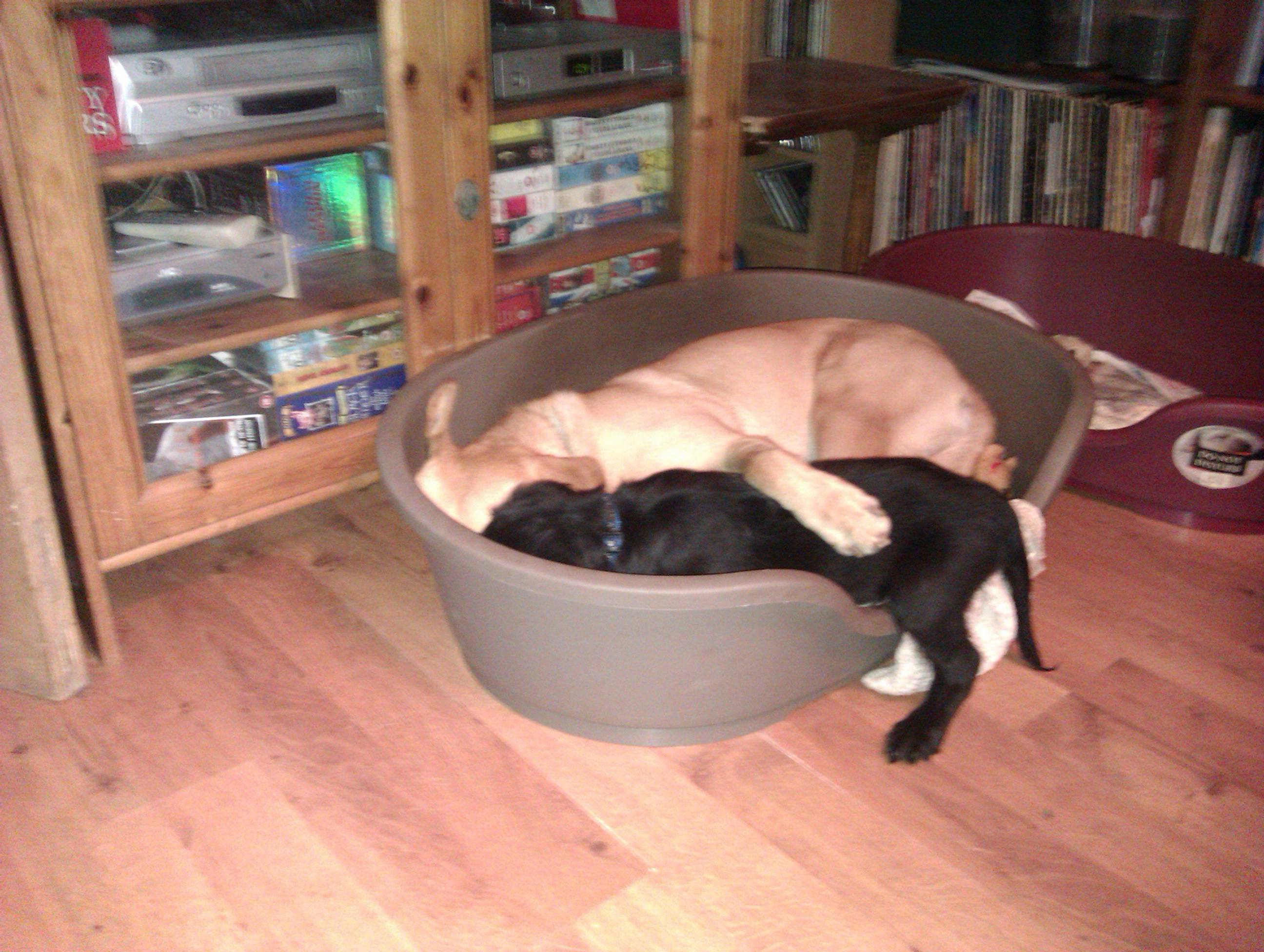 And they call it puppy love My yellow lab with the new springador puppy
