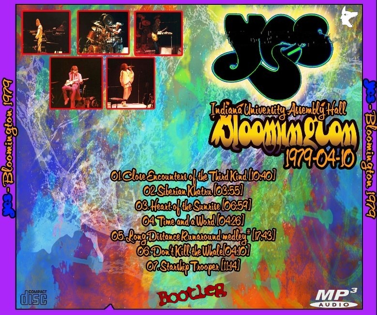 Todays second download is a set by Yes that was recorded at the Indiana University, in Bloomington, Indiana while the band were on the Tormato Tour of 1979. This is in superb quality and is a great set by the band - the audio has been taken from an FM Broadcast. I don't think this is the complete set - but I believe it was all that was broadcast. Still some cracking tracks on this one. I have posted a couple of other boots from this tour in the past - this is another top sounding show. One for all Yes fans..... Here is a download link I found for :- Live at the Indiana University Assembly Hall, Bloomington, Indiana 10.4.79 - Yes (Bootleg) Quality : Superb Tracklisting : 01. Close Encounters of the Third Kind > Siberian Khatru *Medley: Survival / The Fish Schindleria Praematurus / Perpetual Changes/ Soon Download Link : [Link] Filesize : 135MB (Including Artwork and Tracklisting) The Yes Line-up : Back Cover : [Link] Enjoy!