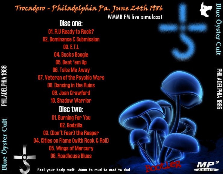 Todays second download is a set by Blue Oyster Cult that was recorded in Philadelphia in June '86. This is in superb quality and has been taken from an FM broadcast on WMMR-FM radio. I've posted a few BOC boots in the past - this is another top sounding show. They play a wicked version of their classic "(Don't Fear) The Reaper" and end with a top cover version of The Doors classic "Roadhouse Blues". This is a great show - thoroughly recommended.. Here is a download link I found for :- Live at the Trocadero, Philadelphia, PA. 24.6.86 - Blue Oyster Cult (Bootleg) Quality : Superb Tracklisting : CD 1 CD 2 Download Links : Part 1 : [Link] Part 2 : [Link] Filesize : 239MB (Including Artwork) Back Cover : [Link] Enjoy!