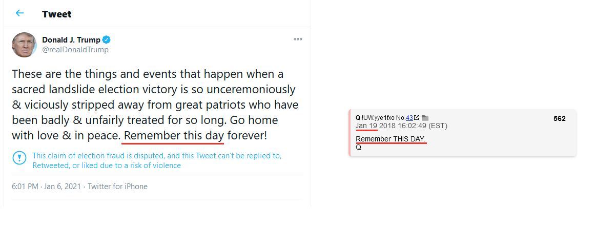 (Check attached) His last tweet before being silenced on twitter. Check Qs quote back in 2018. It’s a show. Trump isn’t the clown you all think he is. You are about to be rudely awakened to how he has in fact, saved your arses. Ps. Maine. Ssshh.