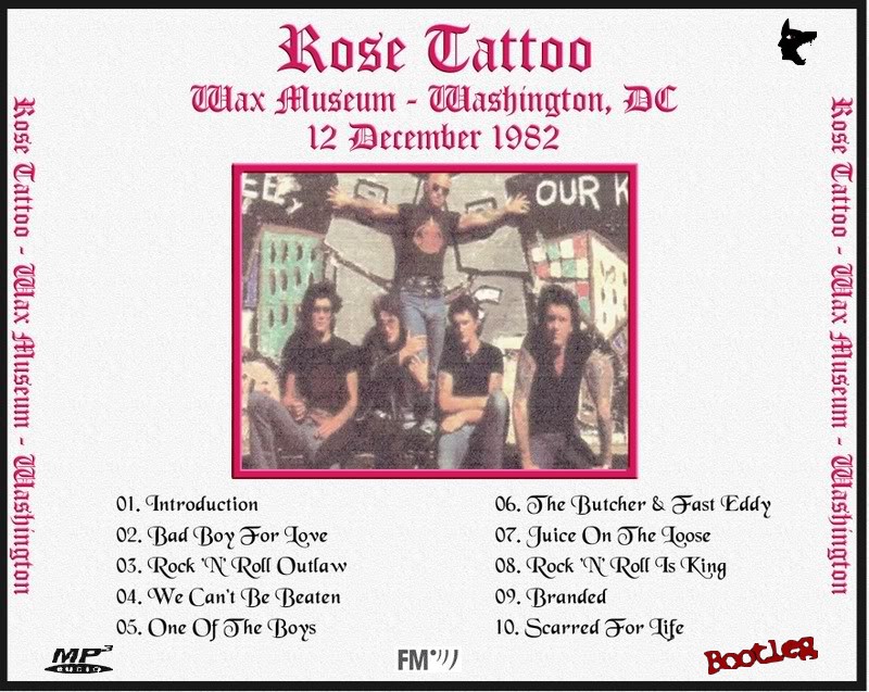 Todays second download is a set by Aussie rockers Rose Tattoo that was recorded in Washington, DC in December 1982. This is in superb quality and the audio has been taken from an fm broadcast of the show. This was during the bands first US tour and is a top sounding show. I've only posted a couple of other boots and albums by this band - I haven't seen many good quality boots to post - so, if you like Rose Tattoo - this is thoroughly recommended.... Here is a download link I found for:- Live at the Wax Museum, Washington DC. 12.12.82 - Rose Tattoo (Bootleg) Quality : Superb Tracklisting : 01 - Introduction Download Link : [Link] Filesize : 104MB Back Cover : [Link] Enjoy!